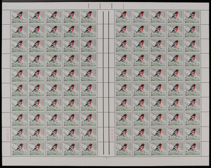 1966 Birds 25c Robin sheet of 100 with Autotrons at top, both red sheet numbers & ACSC listed variety 'grey spot under bird' (Pos RP10/4). Fresh MNH. SG 396(var). ACSC 458 d zb zd ze cat $490. (Image1)