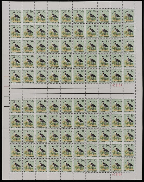 1966 Birds 30c Ibis sheet of 100 with Autotrons at left, both red sheet numbers, variety 'green flaw under W of Straw' (Pos LP3/4). Fresh MNH. SG 397(var). ACSC 459 d zb zd ze cat $630. Rare sheet. (Image1)