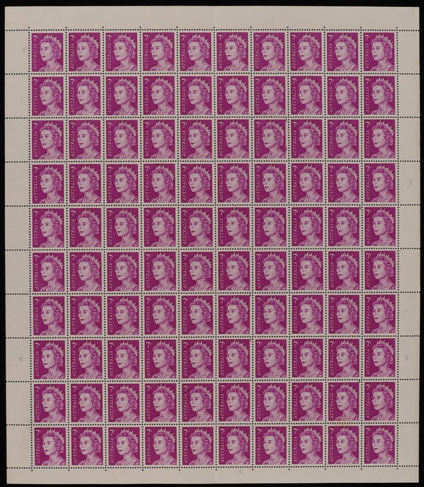 1971 QEII 7c violet sheet of 100. Four stamps with rev adhesions o/w VF MNH. SG 388(var). ACSC 447. (Image1)