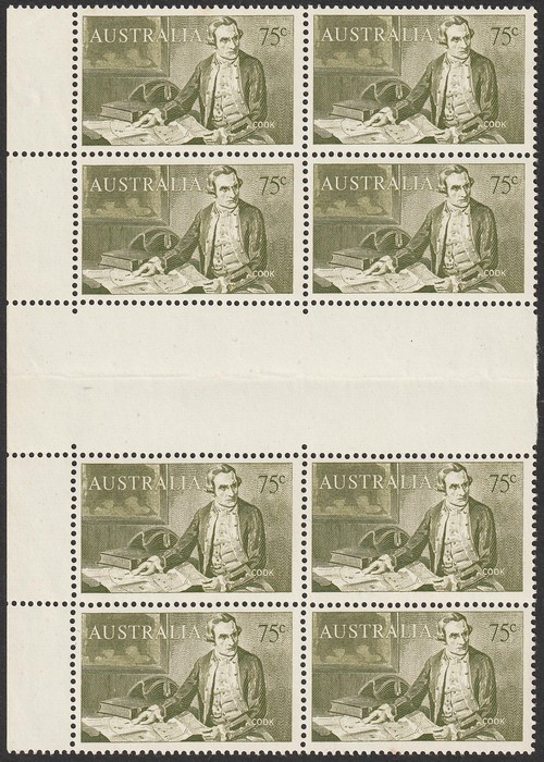 1966 Navigator 75c Cook left marginal vertical gutter blk of 8. Central fold as always, fresh MNH. SG 399(var). ACSC 462 ea cat $300. (Image1)