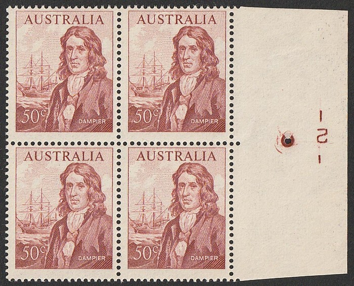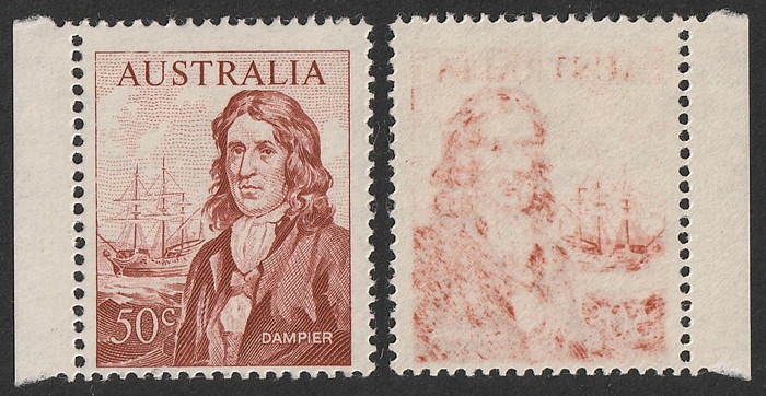 1966 Navigator 50c Dampier variety 'reverse off-set' left marginal. Fresh MNH. SG 399(var). ACSC 461 c cat $375. (Image1)