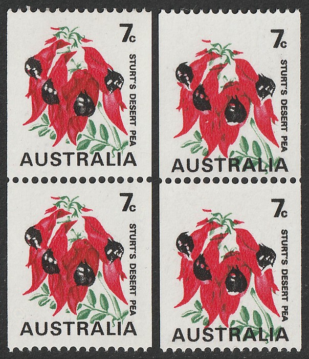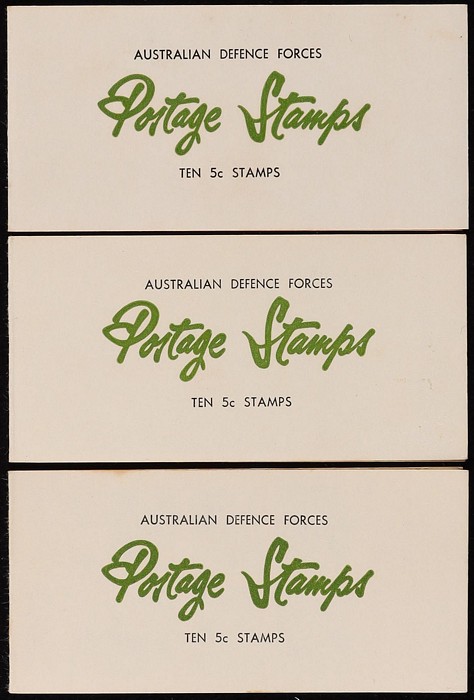 1967-68 Defence Forces 50c with 5c Bird blk of 10 on dark green with gutter line at right affixed at left, no line affixed at left & QEII 5c blk of 10 affixed at right. SG MB1, MB1a & MB2 cat £235. Pfr B128Db, B128Aa & B129b cat $315. (3) (Image1)