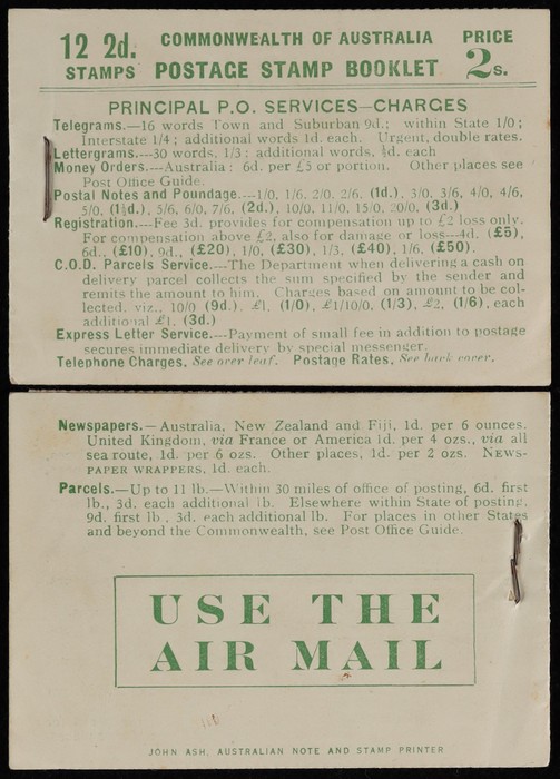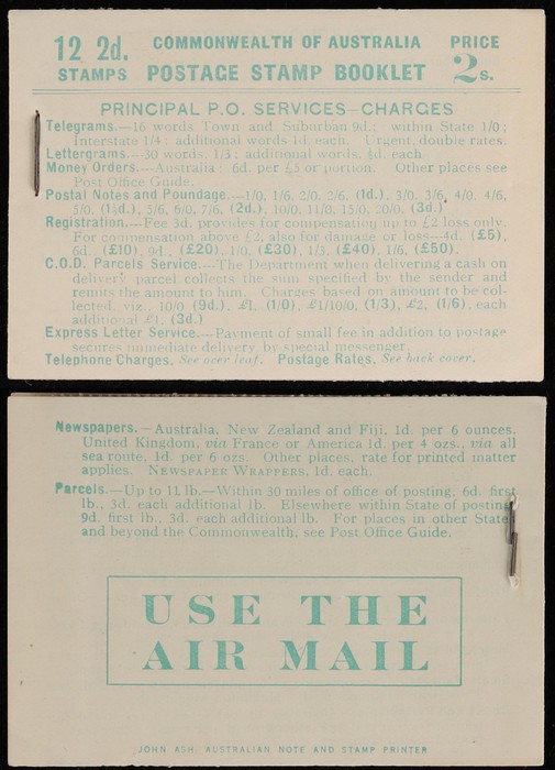 1930 KGV 2/- with 2d red Die III SM wmk inverted, with 2 panes of 6. Back cover with 'USE THE AIRMAIL'. Superb fresh MNH. ACSC/Pfr B41Aa cat $600/$950. SG SB25 cat £425. Scarce so nice. (P) (Image1)