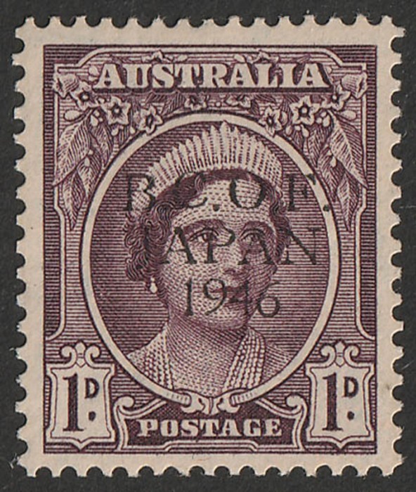 1946 BCOF Japan thin trial opt in black on Queen 1d. VF fresh MNH. SG J2(var), footnote cat £150. ACSC JPP(2)A cat $350. Scarce genuine. (P) (Image1)