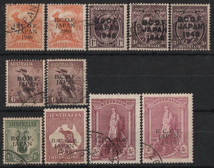 1946-48 BCOF Japan opt set ½d-5/- with both 5/- chalk & rough papers. VFU with correct Australian Army PO cds. SG J1-J7 cat £350. ACSC J1-J8 cat 625. Ex Sandy. (11). (Image1)