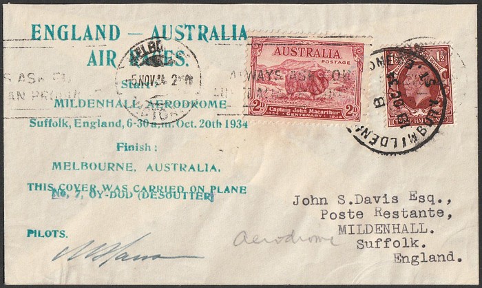 1934 (5 Nov) MacRobertson Air Race cover franked with 2d Macarthur & GB 1½d brown, addressed to England, with 10-line cachet in green, signed by pilot M Hansen. AAMC 441 cat $400. (P) (Image1)
