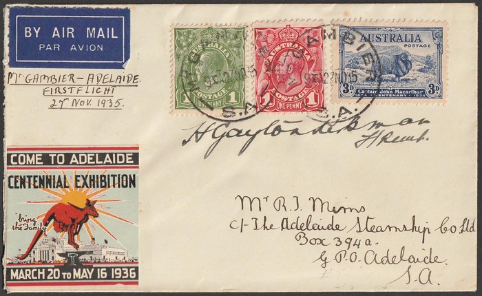 1935 (Nov 27) airmail cover flown on intermediate service Mt Gambier to Adelaide franked with KGV 1d Engraved (cat $300 on cover), 1d green & 3d Macarthur, Centennial Exhibition affixed to LL, signed by pilot H.G.Kirkman. AAMC 561a. (Image1)