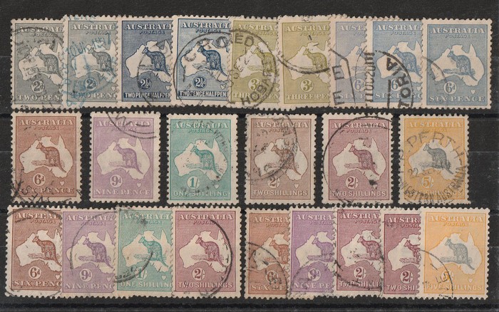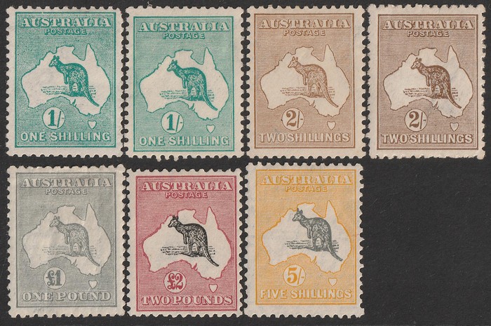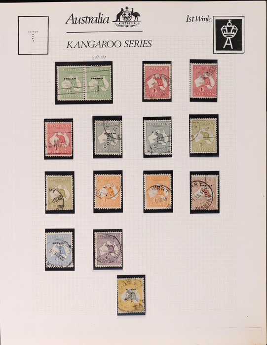 1913-35 Kangaroo Mint collection inc 1st wmk ½d (2), 1d (11), 2d, 2½d (2), 3d (5), 4d (4), 5d (3), 6d (1), 1/- (3), 2nd wmk 2d, 2½d, 9d, 1/- & 2/-, 3rd wmk 2d (2), 2½d (2), 3d (4, 1 Die II), 6d blue (2) & £2 black & rose, 6d brown (5, 1 'broken leg' variety), 9d, 1/- (2), 2/- brown, 2/- maroon, £1 grey, plus SM wmk 6d (3), 9d (3), 1/- (2), 2/- & 5/- (1). CofA wmk 9d (2), 9d, 2/- (6), plus SPECIMEN opts 10/- (2). Mostly F-VF M/MNH. Condition variable throughout, few MNH. SG cat £13,000+. ACSC cat $25,000+. (83) (P) (Image1)