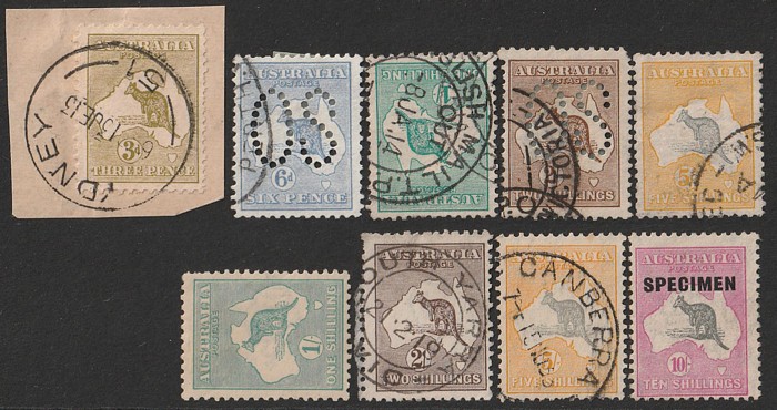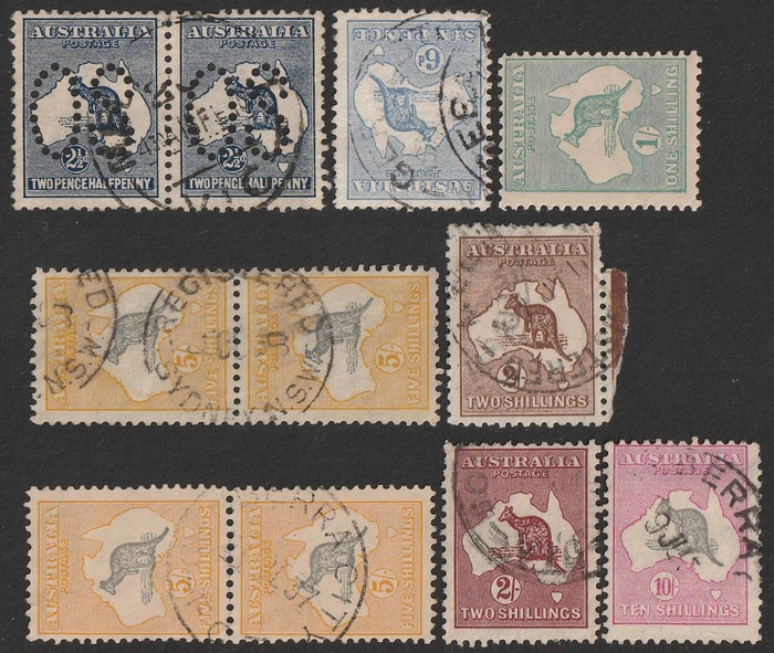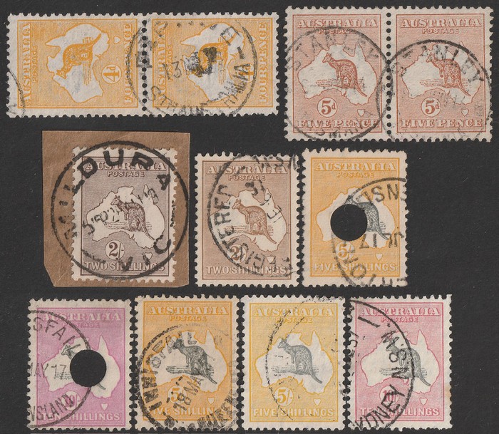 1913-36 Kangaroo collection/accumulation ½d to 10/- on hagners, 1st wmk prs 2d, 3d, 4d & 5d inc 3d bottom margin 'wmk INVERTED', 2nd wmk to 2/-, 3rd wmk to 5/-, Small Multi wmk to 2/-, CofA wmk to 10/-., plus 10/- £1 space fillers. Also noted 2nd wmk 5/- & 3rd wmk 10/- Telegraph Punctures. Some flts, mostly GU-VFU. SG (var). ACSC (var) cat approx $5000+. (300+) (P) (Image1)