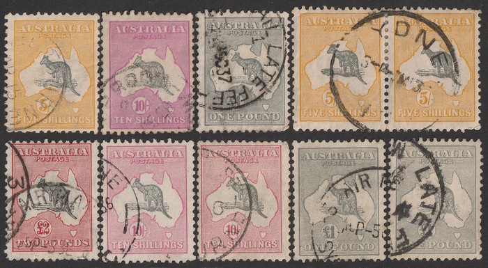Kangaroos: 6d - £2 accumulation inc 1st wmk to 5/-, 3rd wmk 5/- (4), 10/-, £1 grey, SM wmk 5/- (4 inc pr), £2, CofA wmk 5/- (7), 10/- (5), £1 grey (4) inc 2/- intense deep maroon. G-FU/CTO inc 5/- scarce 'Melbourne AP 15 13' CTO for federal MPs. SG cat £5200+. ACSC cat $9400+. (44) (P) (Image1)