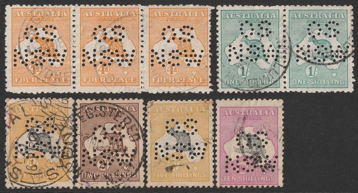 Perf OS NSW: Collection Kangaroo ½d-10/- perf 'OS NSW' inc 1st wmk ½d-1/- with ½d, 1d (all dies), 2d, 3d, 6d & 1/- in prs, 4d orange strip of 3, 2nd wmk 2d-5/- inc 2½d pr (2nd wmk only exist with state punctures, no perf OS. 3rd wmk 2d-10/-, 3d blk of 4, 6d pr. Mostly GU-VFU. SG would cat £1500 for normal OS. ACSC would cat $4000+ for normal OS. Rare official perfins. Ex Sandy. (42). (P) (Image1)