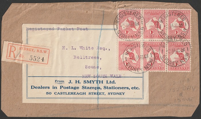 1d Red Die I, BLOCK of 6 on 'Registered Packet Post' parcel front 'Registered Sydney 2 JA 13' cds of FIRST DAY OF ISSUE, to famous philatelist H.L.White at Scone. SG 2(var). ACSC 2Ay cat $15,000+. Important rarity of the Kangaroo issues as only total of 11 FDC recorded & this is a unique franking & usage. Ex Sandy. 2025 Ceremuga AIEP photo cert. (P) (Image1)