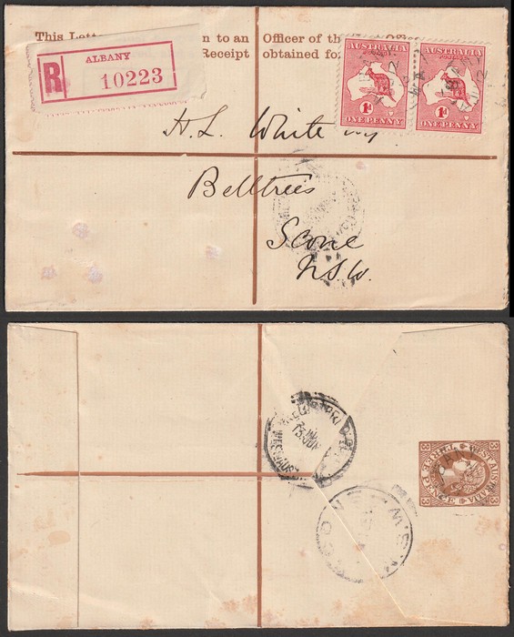 1d Red Die II horiz pr on a Western Australian QV 3d. Registered envelope with (RE4) with 'Albany JU 12, 13' scarce early cds. Addressed to prominent philatelist H.L. White at Scone. F-VF some spots. SG 2d(var). ACSC 3A. Rare mixed franking usage. (P) (Image1)