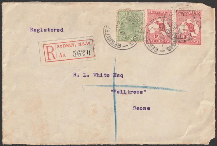 1d Red Die II horiz pr with Qld QV 6d on cover front tied by 'Registered Sydney 2 JA 13' cds of FIRST DAY OF ISSUE, to famous philatelic H.L.White at Scone. SG 2(var). ACSC 3Ay cat $15,000+++ as FDC for Die I. Important rarity of the Kangaroo issues as only total of 11 FDC recorded. ACSC notes Die I & II could exist on FDI covers, but all existing are Die I, so this being a unique franking. Ex Sandy. 2025 Ceremuga AIEP photo cert. (P) (Image1)