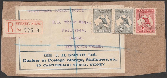 2d Grey (2) & 1d Red Die II on 'registered parcel post' piece with tied 'registered Sydney' cds. Addressed to prominent philatelist H.L. White from stamp dealer J H Smyth. F-VFU. SG 2d & 3(var). ACSC 3A & 5A cat $30++ as loose stamps, $275 as cover. Scarce Parcel Piece. Ex Sandy. 93). (P) (Image1)