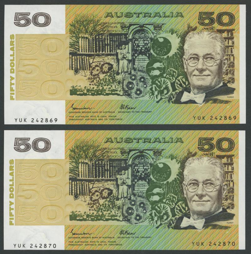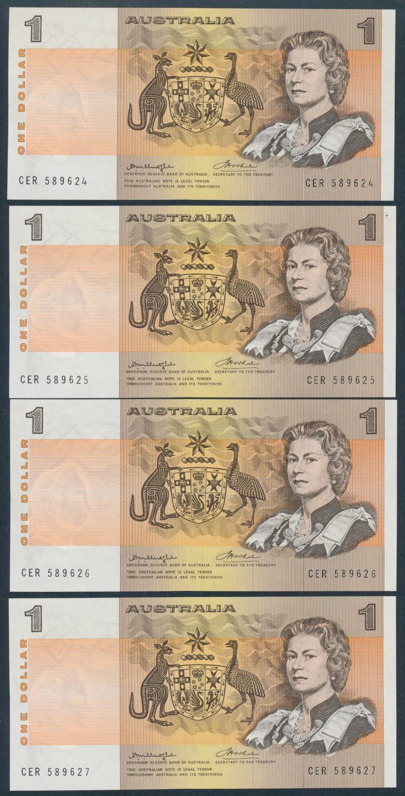 Collection in album with paper $1 1969 Phillips/Randall R73 x2 pairs, 1982 Johnstone/Stone R78 consecutive run of ten; $2 1966 Coombs/Wilson R81, 1985 Johnston/Fraser R89 pair; $5 1976 Knight/Wheeler Gothic Serial Centre Thread R206a, Gothic Side Thread R206b, OCR-B Serial Side Thread R206c, 1979 Knight/Stone R207, 1985 Johnston/Fraser OCR-B R209a, Gothic R209b; polymer $5 Fraser/Cole R214 plus dated (folder note), 1993 Fraser/Evans R216, 1995 R217a, R217ai Narrow Bands, 1996 Macfarlane/Evans R218a, 1997 Test Note Prefixes R218 (prefix 'AT') pair, R218Ti ('CW') pair & ('BN'), 2001 Macfarlane/Evans 'Federation' R219 (2), 2002 Macfarlane/Henry R220a First Prefix run of ten, 2007 Stevens/Henry R221a pair, 2016 Stevens/Fraser R224 run of ten; $10 1988 Johnston/Fraser Bicentennial dated notes (2), Reissue R310b, 1993 Fraser/Evans dated note, & normal R316a, 'Blue & Grey Tenners' folder (4 notes), 1998 Macfarlane/Evans R318c, 2002 Macfarlane/Henry R320a, 2007 Stevens/Henry R321a; $20 1994 Fraser/Evans R416a plus dated note, 1997 Macfarlane/Evans R418a, 2002 Macfarlane/Henry R420a, and 2007 Stevens/Henry R421a, virtually all Uncirculated.