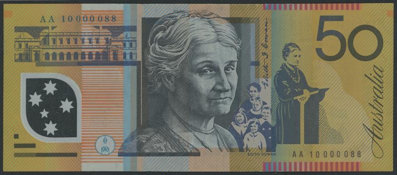 2010 $50 Stevens/Henry R509b Low Number First Prefix serial 'AA10 000088', in PCGS holder graded 'Very Fine 30'. (Image1)