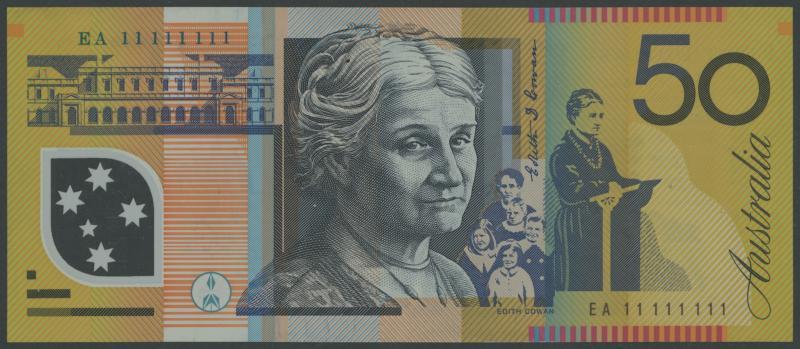2011 $50 Stevens/Henry R512e The Picket Fence Serial 'AE11 111111', (eight digit Solid, RADAR & Repeater note) small lower right corner-fold otherwise Uncirculated. (Image1)