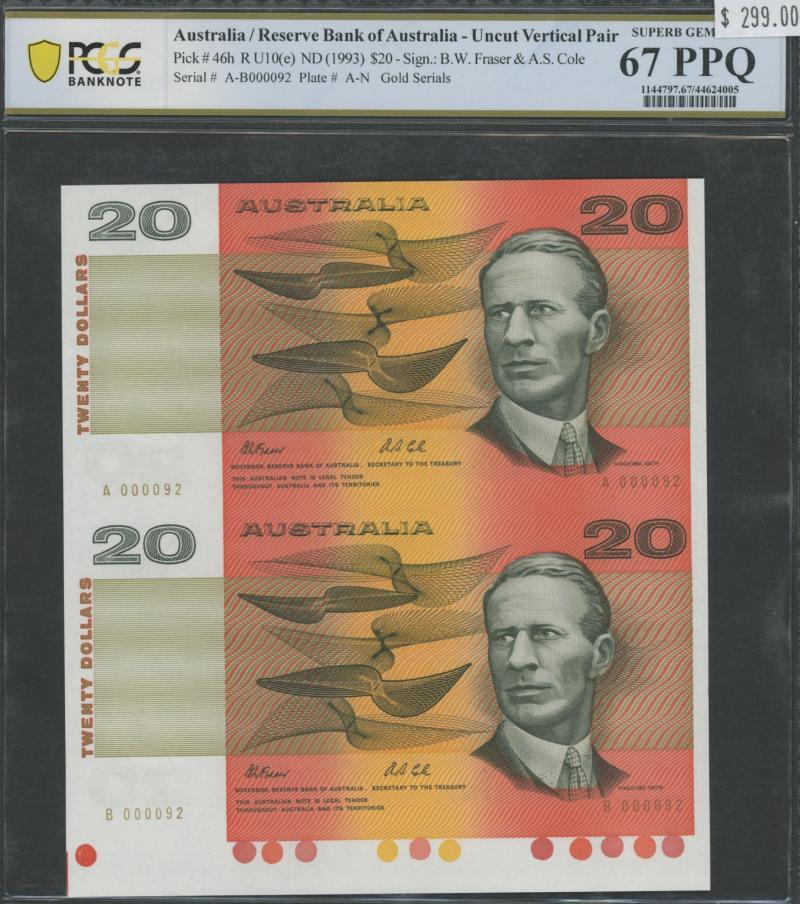 UNCUT NOTES: 1990 $5 Fraser/Higgins vertical pair and block of four in PCGS holders both graded 'Gem Unc 66'; 1991 $10 Fraser/cole with pairs x2 both graded 'Gem Unc 66', and block of four graded 'Superb Gem Unc 67'; 1993 $20 Fraser/Cole pairs x2 on with red serials 'A'-'B 000937', and gold serials 'A'-'B 000937' both 'Superb Gem Unc 67'. (7 items, 18 notes) (Image1)