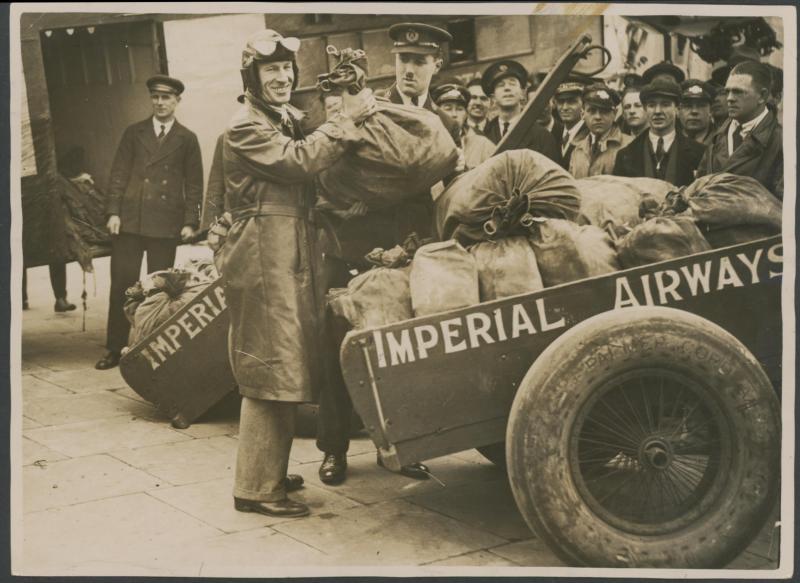 1934 MacRobertson Air Race three large press photographs with roneo'd labels & cachets on the reverse 1) Jacquie Cochran & Wesley Smith before departure from Heston; 2) their fully assembled plane being landed after arriving by ship from America, two small repaired tears at right; and 3) the plane on the wharf beside Wright & Polando's plane 'Utica', minor faults. See AAMC 453: withdrew in Rumania, after damaging the undercarriage on landing at Bucharest.