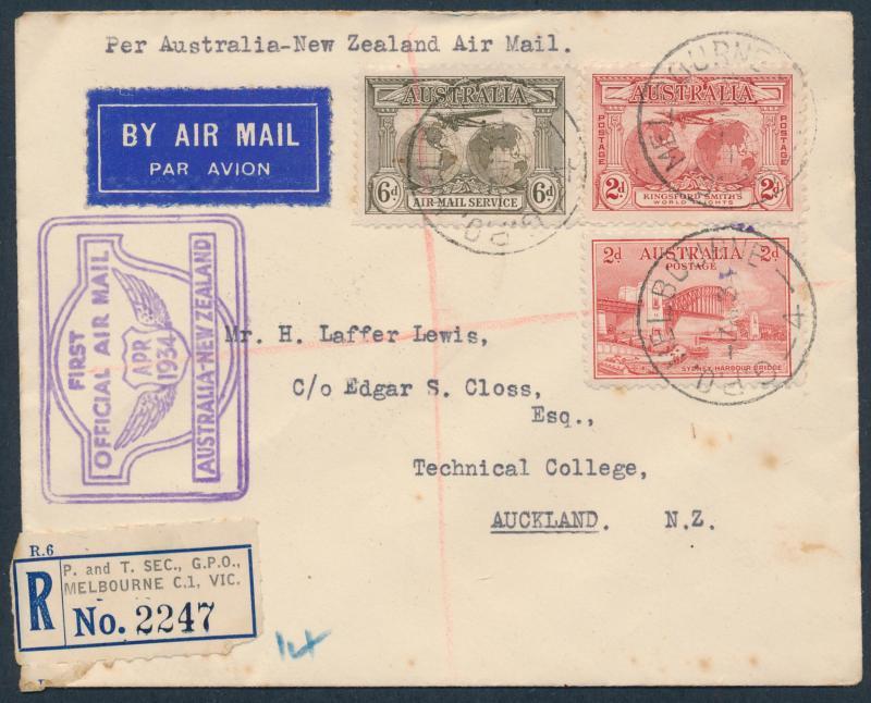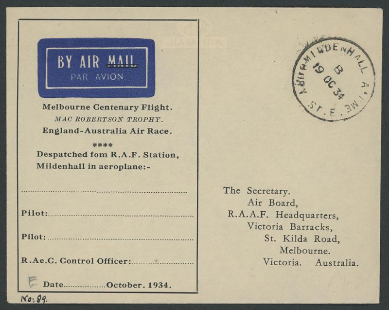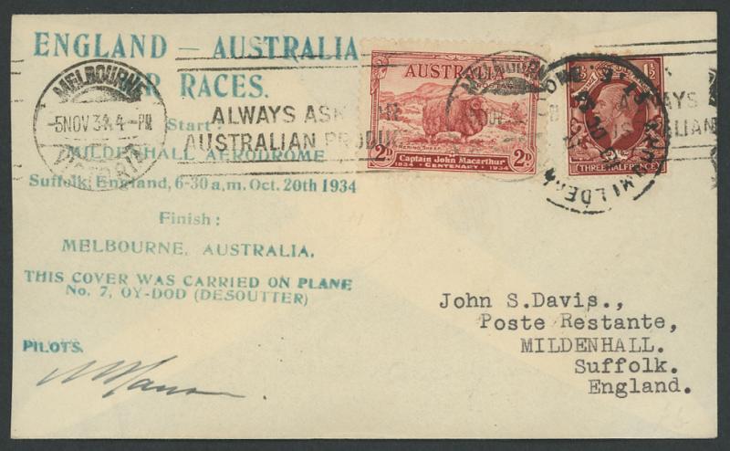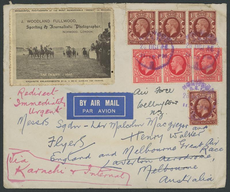 1934 MacRobertson Air Race cover with 'THE DERBY - 1913' label at upper-left, to "Sqdn Ldr Malcolm Macgregor and Hennry Walker/.../Laverton Aerodrome/Melbourne" with GB 1d x3 & 1½d x4 tied by rubber 'NORWOOD/SE19/...' cds in violet, Melbourne backstamp of '22NO34' & redirected to "Air Force/Wellington/NZ", minor imperfections. Unusual. See AAMC 440. (Image1)