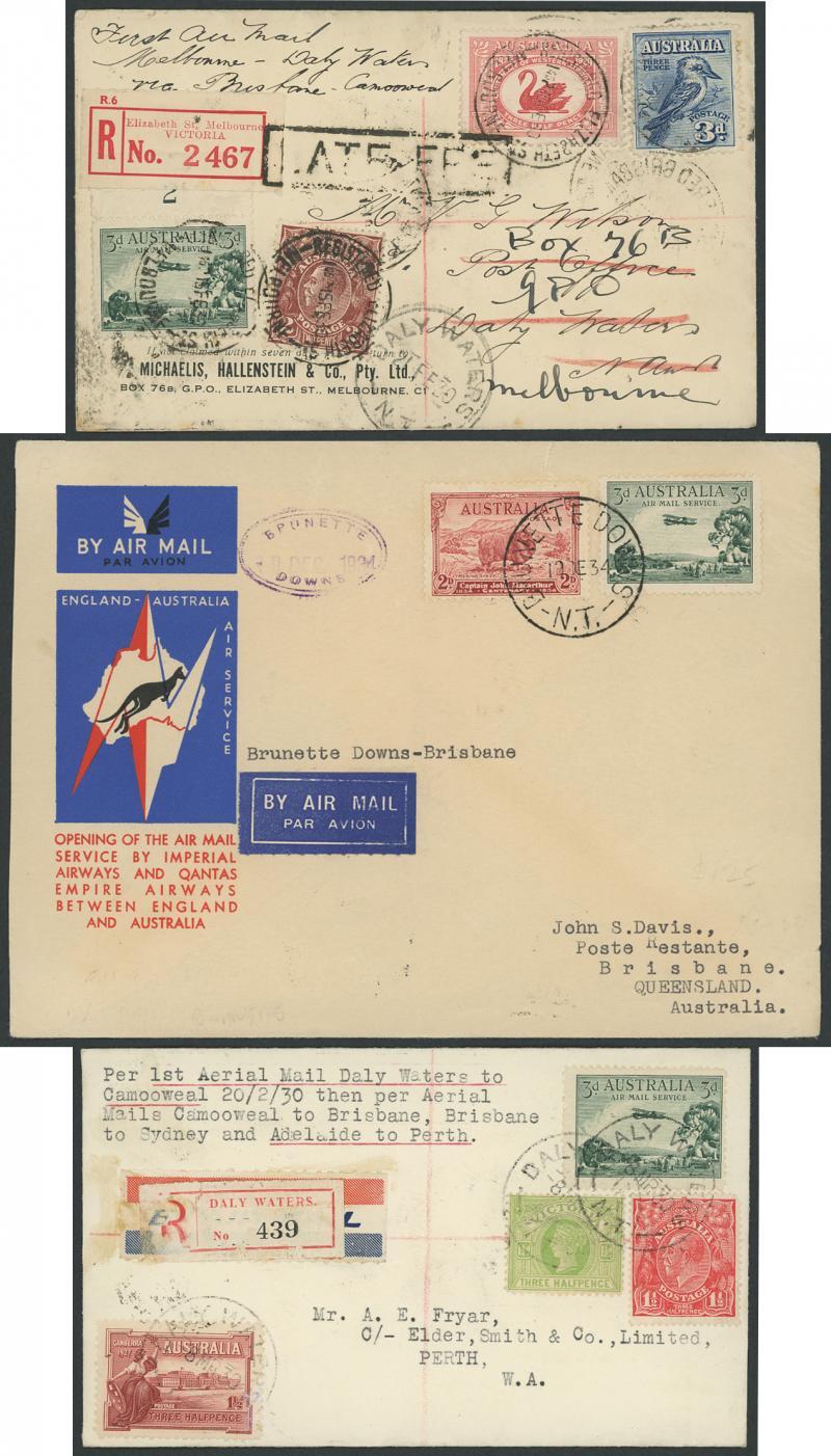 Northern Territory pre-WWII selection including 1930 Camooweal-Daly Waters registered from Melbourne with 'LATE FEE' handstamp, Daly Water-Camooweal return flight with 'DALY WATERS' red & black/white R label (small faults), and one from a week later endorsed for first flight "Alexandra (NA) to Brunette Downs (NA)" - neither of which had a Post Office - to "Tanganyika, East Africa" (!) with Airmail 3d and KGV 1½d & 3d uncancelled but with 'ALEXANDRIA/27 FEB.1930' [sic] violet cachet below & on reverse and '6 MAR.1930' (Brunette Downs arrival?) at lower-left, 1931 England-Darwin and return, 1934 Perth-Daly Waters and return, 1934 Imperial Airways/QANTAS Australia-England with stamped tied 'BRUNETTE DOWNS/NT' cds and 'BRUNETTE/-9 DEC 1934/DOWNS' double-ring oval Station Office handstamp, 1935 Adelaide-Darwin pilot-signed & return, 1935 'ALICE SPRINGS' to Adelaide and 'TENNANT CREEK' to Adelaide, 1937 'KATHERINE' to Adelaide, etc, plus 'Edith River' & 'Adelaide River' picture postcards, also 1936 South Australia set on illustrated First Day Cover registered with 'GLENELG' cds and 1938 Sydney Philatelic Exhibition hexagonal datestamp on KGV ½d and Postage Dues ½d plus Exhibition cinderella on illustrated envelope, condition generally fine to very fine.