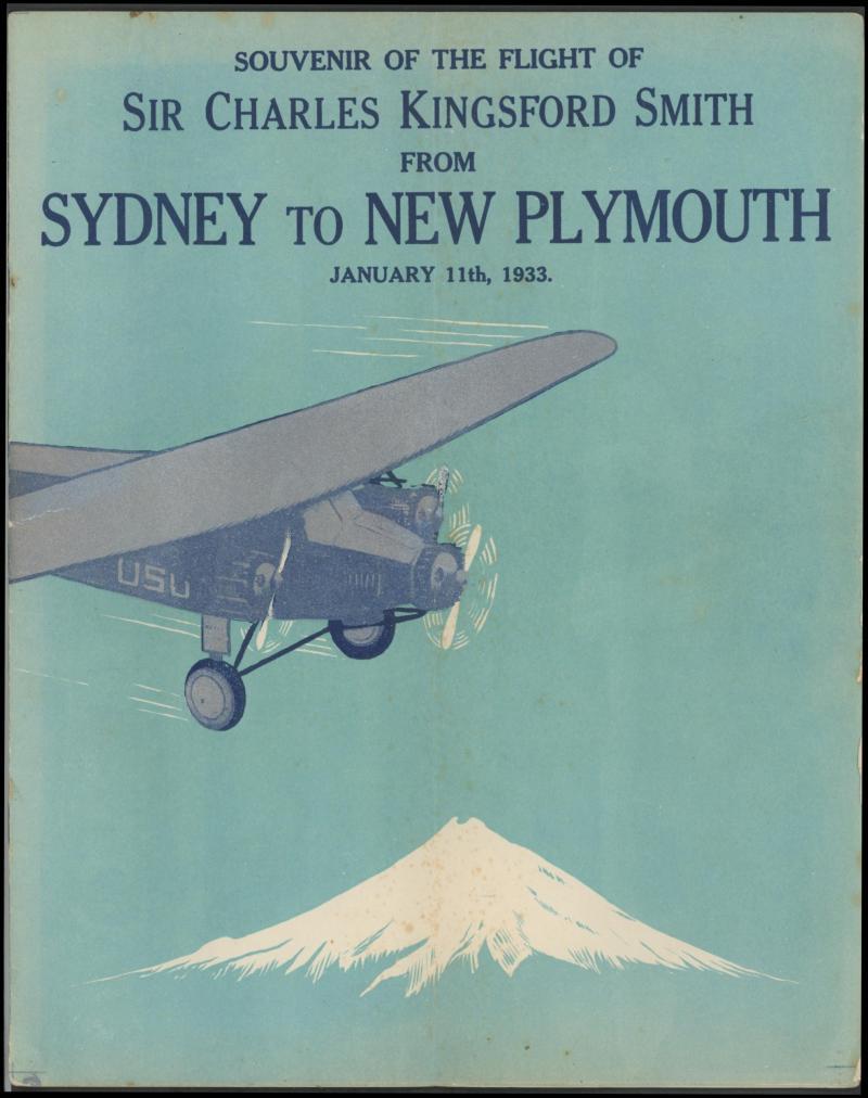 1933 (Jan 11) 16pp quarto-size brochure 'Souvenir of the Flight of/Sir Charles Kingsford Smith/from/Sydney to New Plymouth', scuffed on the back cover & vertical mailing fold otherwisae very fine. Very scarce. (Image1)
