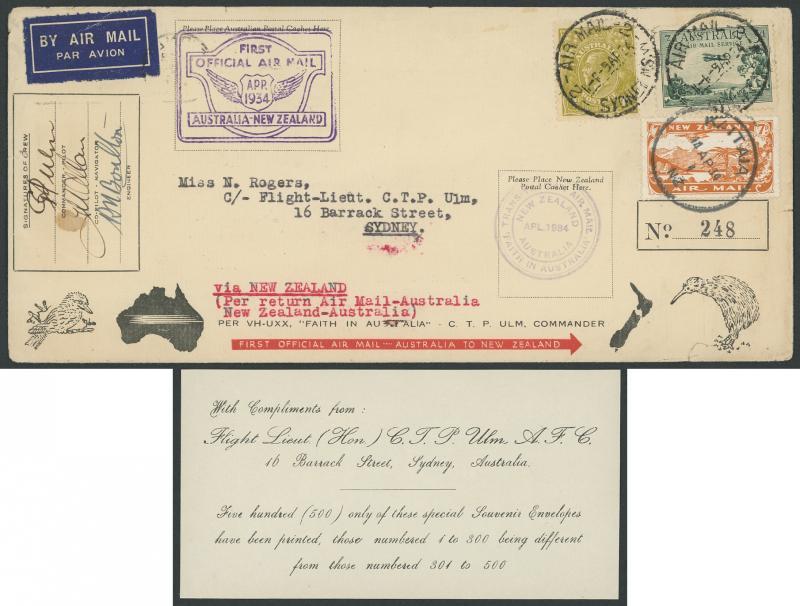 1934 Australia-New Zealand-Australia long-format specially-printed illustrated envelope with Kookaburra & Kiwi and maps of Australia & New Zealand, and 'No.' box with handstamped '248', Australia 3d Airmail & KGV 4d olive tied by Sydney cds and New Zealand 7d Airmail tied by Kaitara cds for 'boomerang' return flight AAMC 371, both flight cachets applied in the pre-printed boxes and signed by pilots & crew CTP Ulm, GU Allan & RN Boulton in the pre-printed autograph panel at left, Auckland & Sydney receiving backstamps plus 'With Compliments Flight Lieut (Hon) CTP Ulm AFC' slip attached to the reverse stating 'Five hundred (500) only of these special Souvenir Envelopes have been printed, those numbered 1 to 300 being different from those numbered 301 to 500', a few minor blemishes. There were 11,000+ 'boomerang' covers carried both ways, but we have never seen this special envelope before, nor is it mentioned or listed in the AAMC. (Image1)
