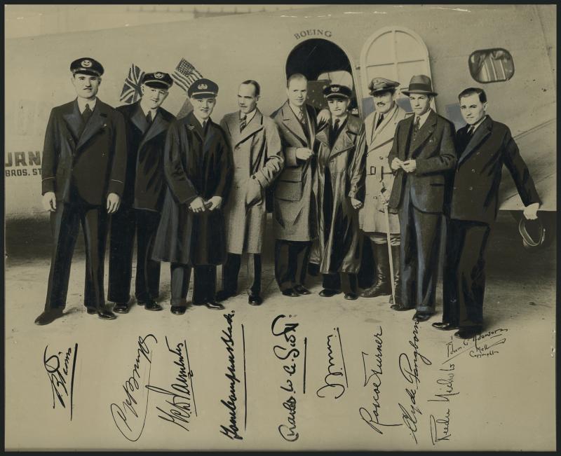 1934 MacRobertson Air Race American airmail envelope with GB 1½d tied by London machine & Australia KGV 1d green tied by Melbourne arrival cds, small race cachet in violet signed "Roscoe Turner" in green, AAMC 434, Cat $100; plus very fine promotional card of Turner & his Boeing 247 named 'Warner Bros Comet', large Acme Newspictures photo of the plane x2 (one in flight over Mildenhall); second-generation photo of Turner meeting KGV at Mildenhall & signed by Turner in green; contrived photo-montage (creased at the top) of nine men including Turner, Clyde Pangborn and their passenger Reeder Nichols with facsimile signatures below and a newspaper cutting of the 'photo' & signatures as published; modern PPC of the plane; and a non-contemporary print of Turner and Edward, Prince of Wales at Mildenhall.