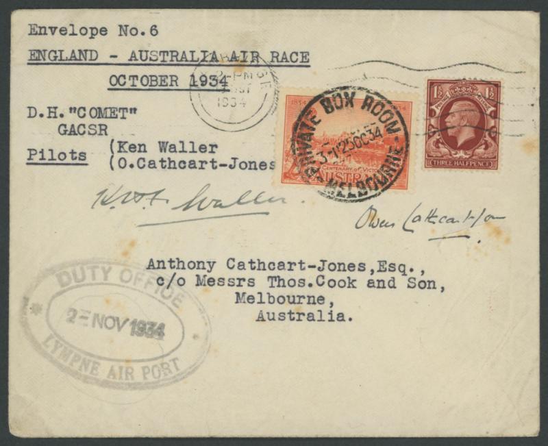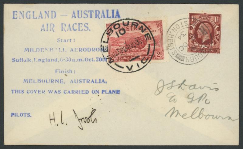 1934 MacRobertson Air Race printed 'boomerang' cover for Scott & Campbell-Black with GB ½d tied by 'WEST KENTISH...' cds & 1/2d in Australian stamps cancelled on arrival at Melbourne with blue & black/white R label, signed on the reverse by "Tom Campbell Black" & "CWA Scott" with 'GROSVENOR HOUSE - Arrived Melbourne/...' cachet in violet, minor toning, AAMC 433, Cat $1250. See also the next lot. (Image1)