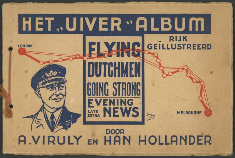 1934 MacRobertson Air Race 'Het Uiver Album/Flying/Dutchmen/...' souvenir book for the flight published by J Vlieger Amsterdam (Nov 1934), in Dutch with a lengthy introduction featuring photos of many of the entrants & their planes, then a well-illustrated telling of the story of the flight to Australia, with the Race results, string-bound, the cover with minor blemishes, damp spotting on the title page & less noticeable on the next few pages thereafter very fine. (Image1)