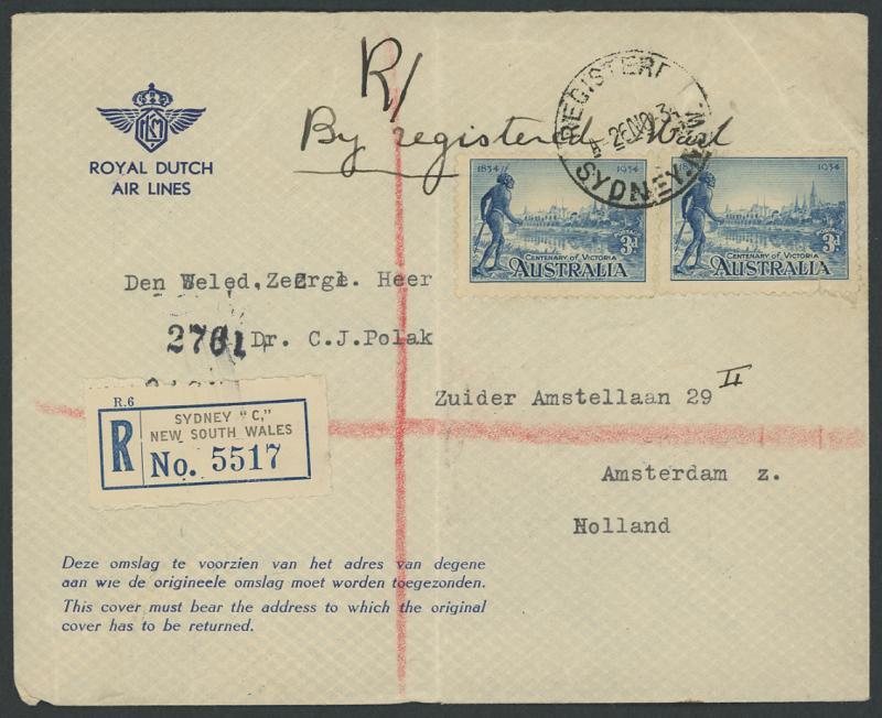 1934 MacRobertson Air Race mostly KLM envelopes from Sydney by surface mail at 3d rate used to return covers carried per 'Uiver' in the Race datred 6.11.1934 x3, 20.11 x2, 26.11 (registered) or 28.11 x2, all with huge 'ROYAL DUTCH AIRWAYS/...SYDNEY' Race cachet on the reverse, variously addressed to Netherlands x4, England x2, Scotland or Belgium, vertical folds.