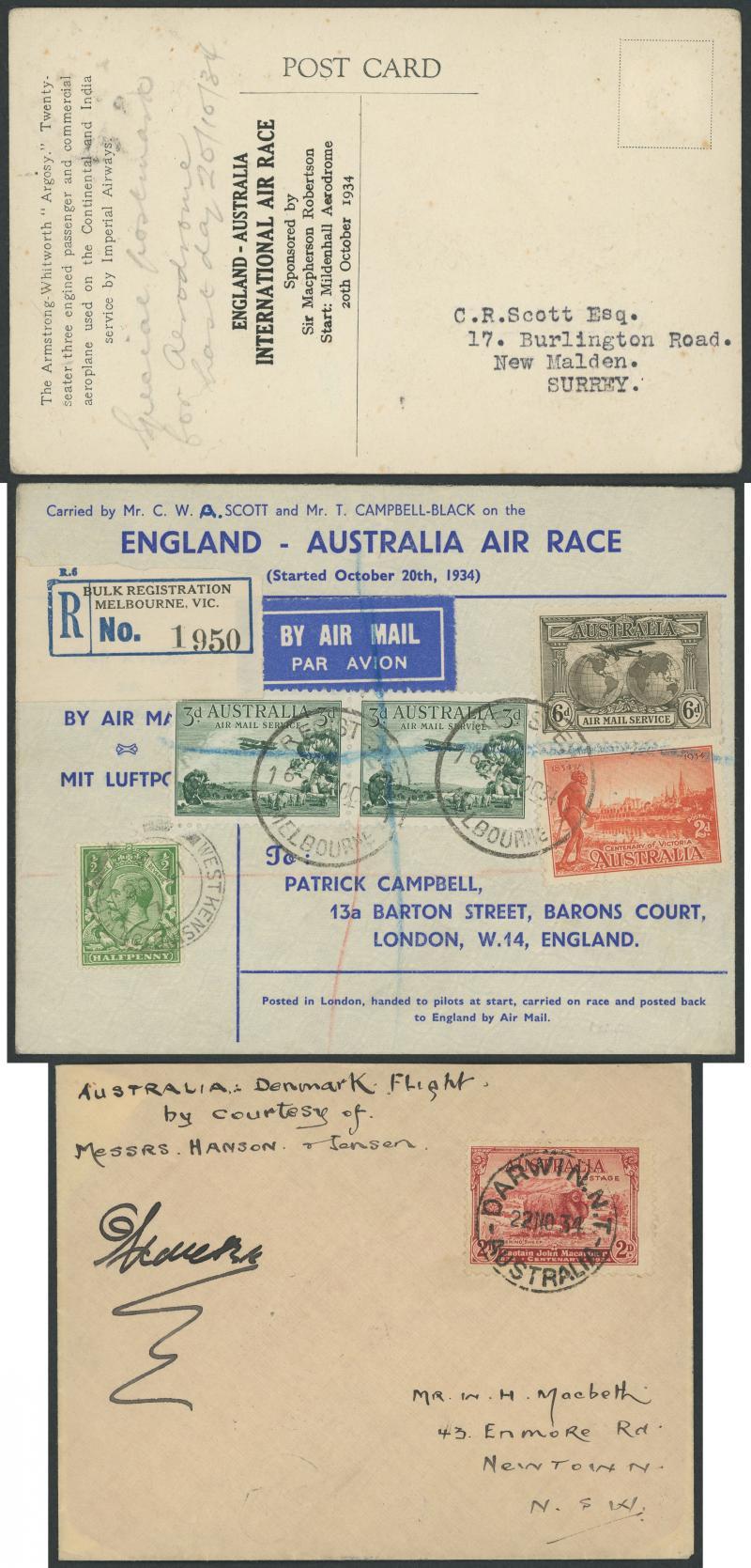 1934 MacRobertson Air Race a similar group to the previous lot with a few additional items including two Race PPCs, Race cover flown to Germany & race PPC used locally, printed Race cover signed on the reverse by the race winners "CWA Scott" & "Tom Campbell Black", faked Hansen & Jensen cover, and a couple of others, mostly fine to very fine.