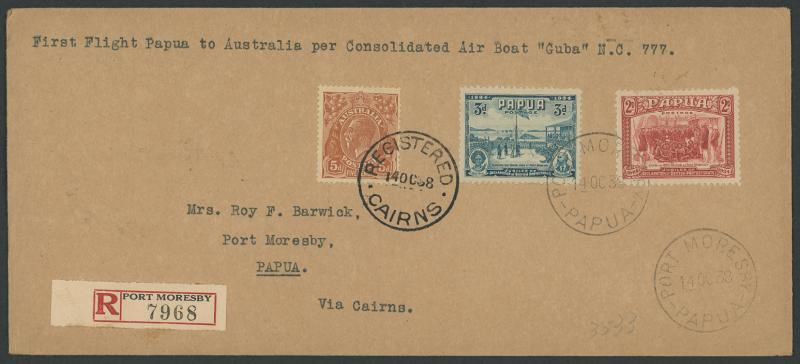 1938 (Oct 14) per 'Guba II' Port Moresby-Cairns to effect repairs, red & black/white R label AAMC P140; and (Nov 21) Port Moresby-Sydney for further repairs P40a, both with Papuan stamps + KGV 5d for the return flights to Moresby, Cat $3500.