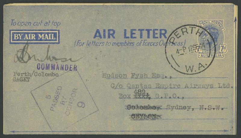 1944-45 Qantas Ceylon flights comprising '12SE44' Perth-Colombo-Sydney 7d Air Letter signed by "LAmbrose", '14NO/44' Colombo-Sydney 10c+10c+10c+10c Air Letter signed by "LAmbrose", '1JU/45' Colombo-Sydney 10c+10c+10c+10c Air Letter signed by "SK Howard" & "HB Hussey", '4OC45' Sydney-Singapore per 'Coriolanus' signed by "KG Caldwell" & "FA Reeve", '29NO45' Sydney-Colombo per 'Liberator' signed "HT House" & "JA Furze", and '2DE45' return flight Colombo-Sydney signed "JA Furze" & "JG Moxham", plus a premium for the signatures.
