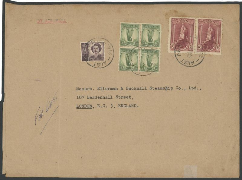 POSTAL HISTORY: 1949 (Aug 3) oversize cover (230x170mm) with oval 'NISHIKA MARITIME COMPANY/ SHIP'S AGENTS/ NAGOYA, JAPAN' cachets on the reverse, to London with Princess 1d + Lyrebird 1/- block of 4 + Robes Thin Paper 5/- horizontal pair tied by 'AUST ARMY PO/214' cds used at Empire House in Tokyo, arrival backstamp of 11NO49, vertical fold at left & minor defects. Ex 'Tillie Mitchell': sold at our auction of 29.8.2020 for $649. [The only multiple of the Thin Paper 5/- we have seen on cover] (Image1)