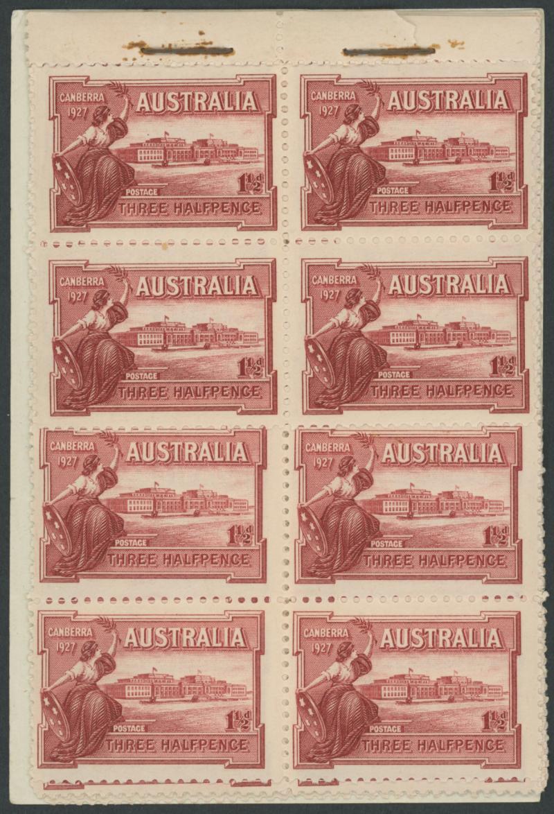 1927 Canberra 'Jumbo' Booklet with 5½ blocks of 8 (2x4) remaining stapled in the upper margins with backing paper of the same stock as the issued Canberra booklets, minor rust around the staple otherwise remarkably fine. Rare. Geoff Kellow states "Several are recorded, most with some panes of stamps removed". Long considered a 'mystery' issue, perhaps of private manufacture, Kellow goes on to state that these booklets were prepared by the Post Office: A Post Office memorandum states "...these will be in strips of 8 fastened into lots of 80 to represent the number in the whole sheet". If the Post Office could call a Registration Envelope a 'Registered Letter', it could call a block a 'strip'. (Image1)