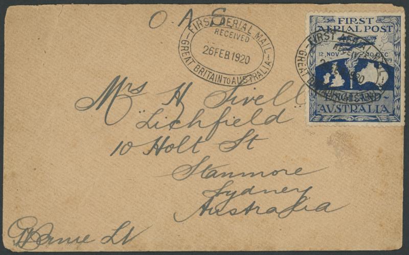 1919-20 England-Australia Ross & Keith Smith Flight 'FIRST/AERIAL POST' vignette tied to "OAS" envelope by one of two very fine strikes of the double-oval 'FIRST AERIAL MAIL/RECEIVED/26FEB1920/GREAT BRITAIN TO AUSTRALIA' datestamp AAMC 27, addressed to "Mrs H Sivell,/.../Stanmore, Sydney...", endorsed "G Bernie Lt" at lower-left and signed on the reverse "J Bennett, Darwin, 12 12 19" with a large manuscript "18" above, slightly aged and part of the flap missing, Cat $5000. Listed by Tom Frommer as cover 298 in his handbook. Two similar covers - graded 'B' or '(B)' - sold at our auction of 23.5.2024 for $5040 and $5520 respectively (Sale 256 Lots 2283 & 2291).. (Image1)