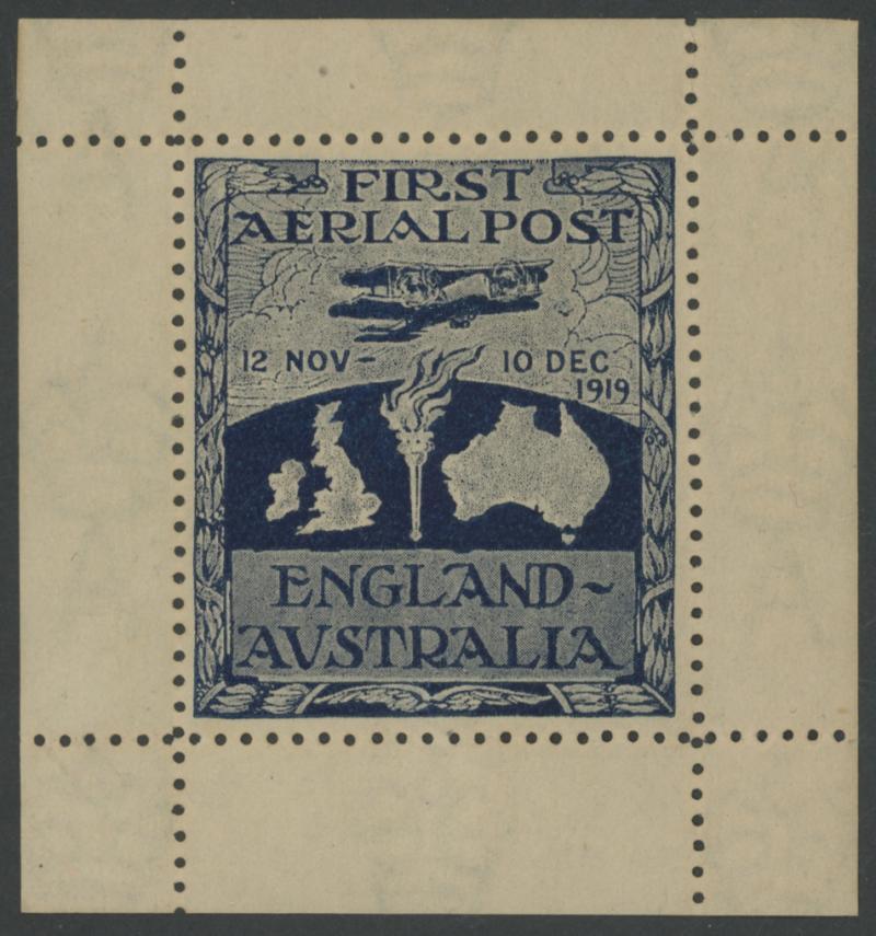 1919-20 England-Australia Ross & Keith Smith Flight 'FIRST/AERIAL POST' vignette with full margins AAMC 27b, very well-centred, a bit aged, Cat $18,000. (Image1)