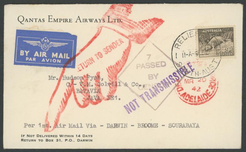1942 Australia-Netherlands Indies Shuttle QANTAS Empire Airways envelope endorsed "Per 1st Air Mail via DARWIN-BROOME-SOERABAJA" with Qantas 'QEA' blue/white airmail label and 9d Platypus tied by 'RELIEF No.3/-6JA42/SOUTH-AUST' cds in use at Darwin No.1 Military PO, ' 7 /PASSED/BY/CENSOR/ 2 ' diamond cachet used at Darwin (John Little "scarce") on the face but returned with 'NOT TRANSMISSIBLE' handstamp in violet, 'Fickle Fiinger' cachet in red and 'DEAD LETTER OFFICE/ADELAIDE' cds in red all on the face, a few minor blemishes. Due to the Japanese encroachment upon and subsequent invasion of the Netherlands Indies, the planned shuttle service between Broome & Java was abandoned. Unlisted in the AAMC. (Image1)