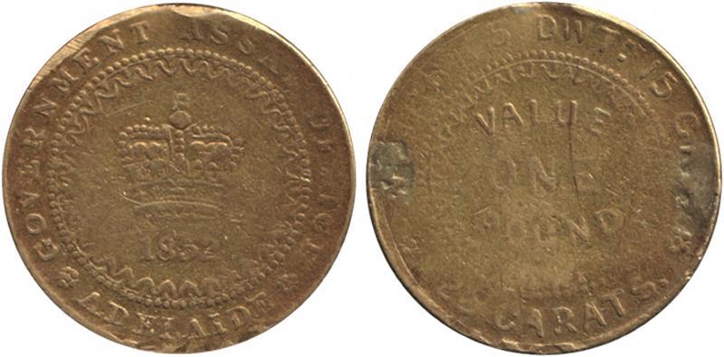 Adelaide Pound Type II 1852, Obv. 'VALUE/ONE/POUND' surrounded by crenellations within beaded circle, ' WEIGHT 5 DWT 15GRS/* 22 CARAT * ', rev. '[Crown]/1852' surrounded by crenellations within beaded circle, 'GOVERNMENT ASSAY OFFICE/* ADELAIDE *', obverse rim knock VG, reverse ex mounts Poor. (Image1)