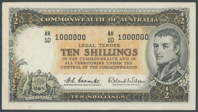 Million Numbered Serial 1961 10/- Coombs/Wilson Reserve Bank R17m serial 'AH/10 1000000' in PCGS holder graded 'About Unc 50'. (Cat $15,500 for Unc) (Image1)