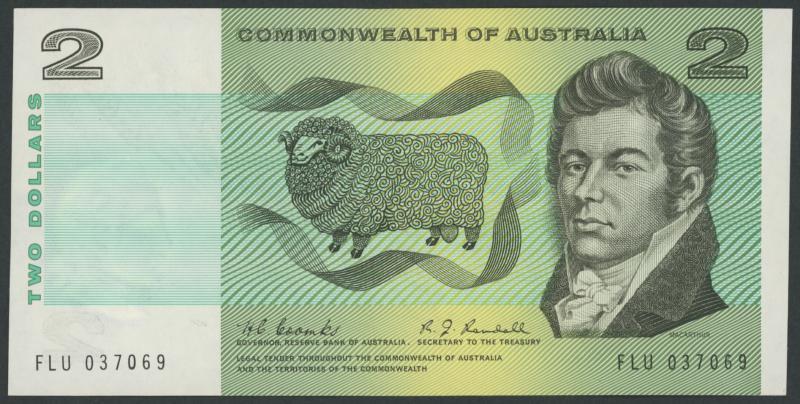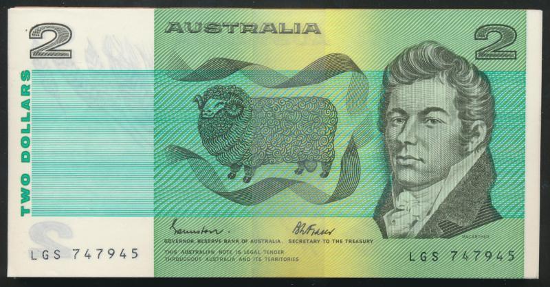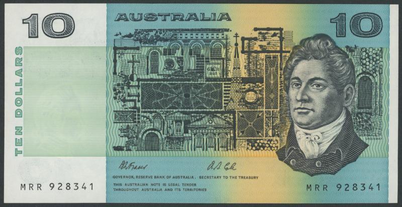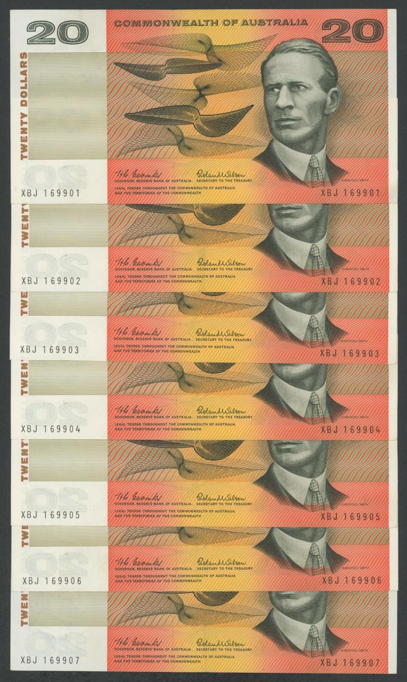 Box containing $1 (10) including 1972 R74 pair, 1979 Knight/Stone R77 in PCGS holder graded '66 Gen Unc'; $2 (19) 1966 Coombs/Wilson R81 x5; 1968 Phillips/Randall R83 x3 (two with light teller-bends); 1974 Phillips/Wheeler 'AUSTRALIA' R85 x4; 1976 Knight/Wheeler OCR-B Side Thread R86c x4 (two pairs); and 1985 Johnston/Fraser R89L Last Prefix 'LQG' x3 (some a little aged); $5 Fraser/Cole polymer R214i Light Green Serials run of five; $10 1988 Bicentenary 1st issue, and dated folder note (re-packaged), 1993 Eminent Women prefix 'AP' note & stamp #3280 folder with cardboard outer; and $20 Johnston/Fraser OCR-B R409a; condition variable mostly Unc.