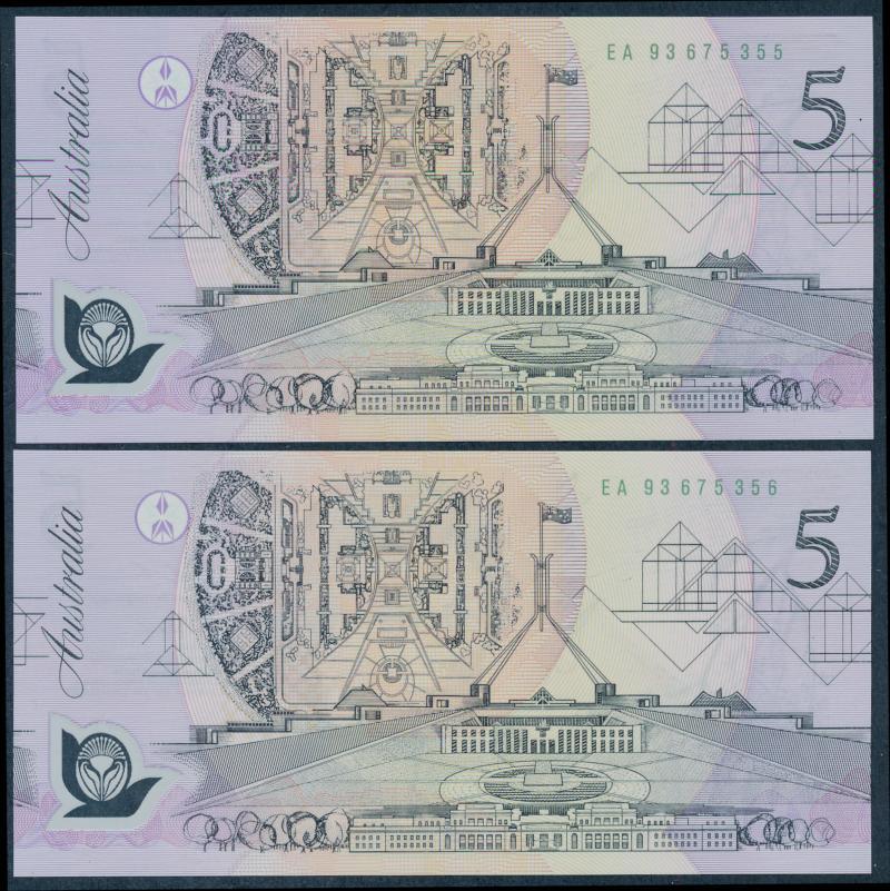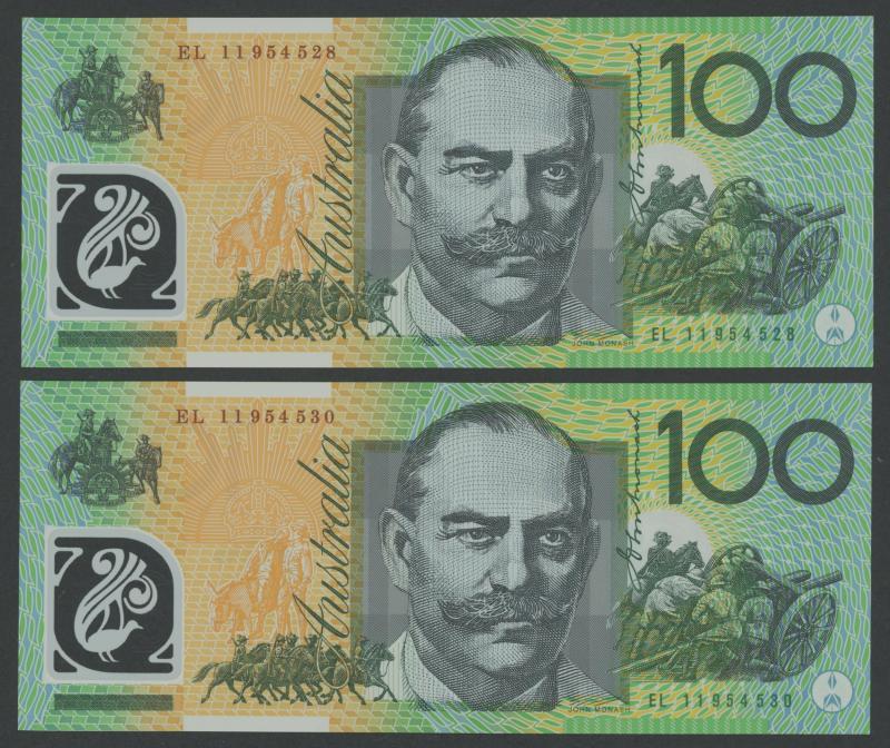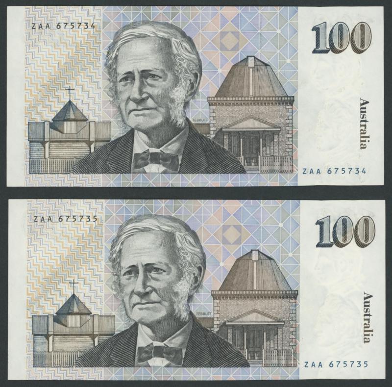 1984 $100 Johnston/Stone R608F pair First Prefix serials 'ZAA 675734'-'735', lightest bend on one unit, Unc, Cat $1540.