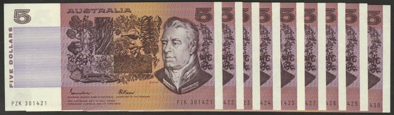 1983 $5 Johnston/Fraser Gothic Serials R209b consecutive run of ten 'PZK 301421'-'430, Uncirculated, Cat $800.