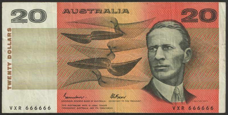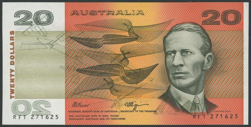 1991 $20 Fraser/Higgins R412 serial 'RFT 271625', with printers offset (wet ink transfer) showing reverse design mirrored '20' above left serial and Lawrence Hargrave's aerofoil box-kite designs on obverse, Uncirculated. An unusual error. (Image1)