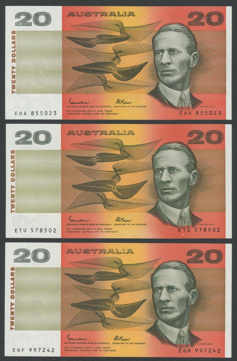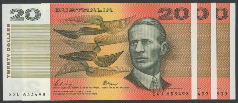 1989 $20 Phillips/Fraser R411 run of three serials 'EXU 633498'-'500', Uncirculated, Cat $540. (Image1)