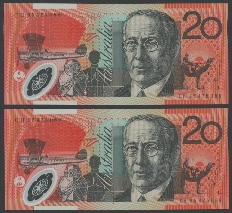 1995 $20 Fraser/Evans R416b consecutive run of four serials 'CH95 475088'-'091', Uncirculated, Cat $1200.