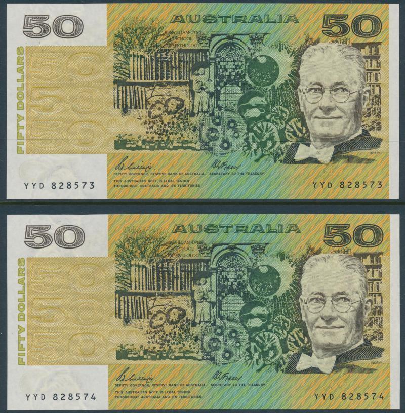1989 $50 Phillips/Fraser R511 consecutive run of five serials 'YYD 828573'-'577', Uncirculated, Cat $1125.