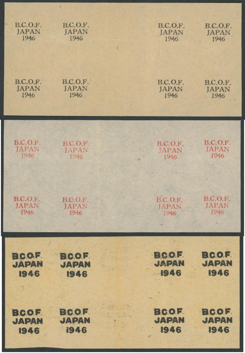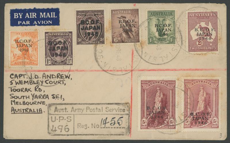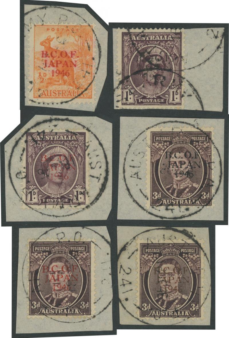 TYPE ONE (THIN OVERPRINT) ON STAMPS: ½d in Red, 1d in Black, 1d in Red, 3d in Black, 3d in Red and 3d in Gold ACSC J1PP(1)A-J3PP(2)C, characteristic variable centring, tied to separate pieces by 'AUST ARMY PO/18OC46/ 241. ' cds in use at BCOF HQ at Kure, Cat $4500 (£1600 for unmounted mint in a footnote below SG J7a; unpriced used). Another unusual opportunity. (6) (Image1)